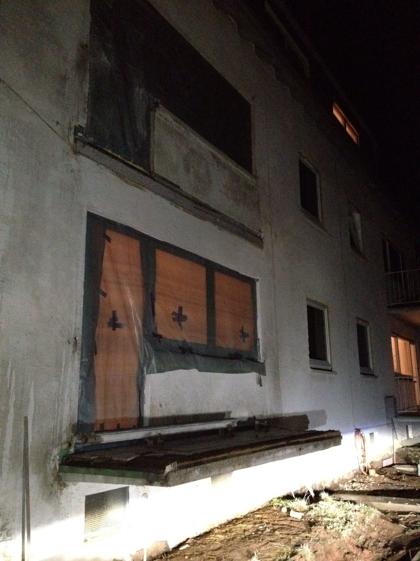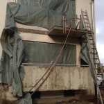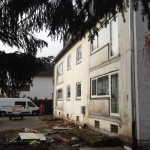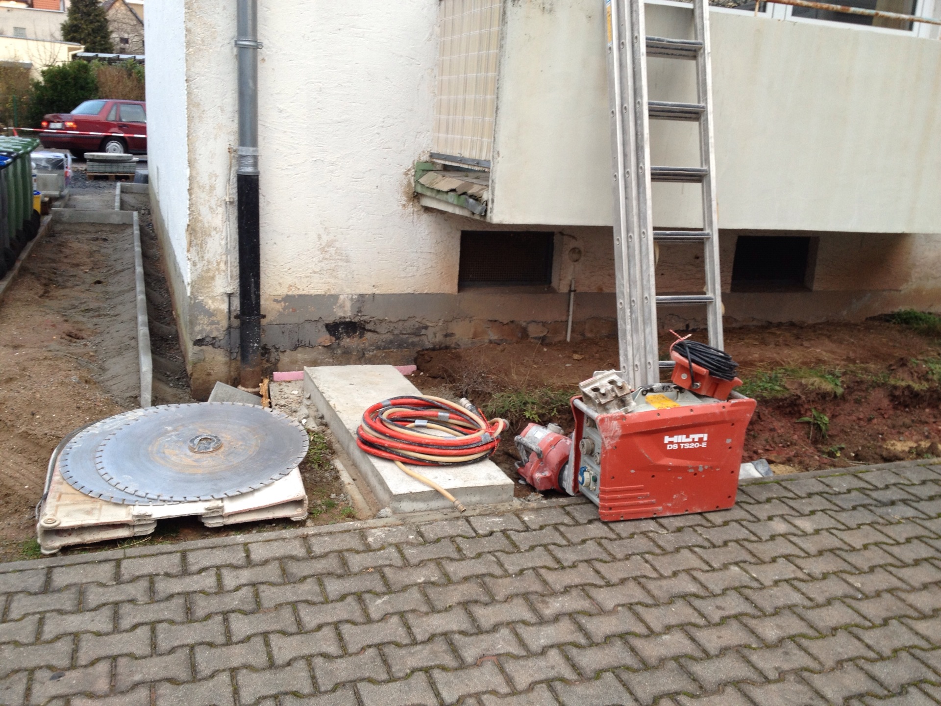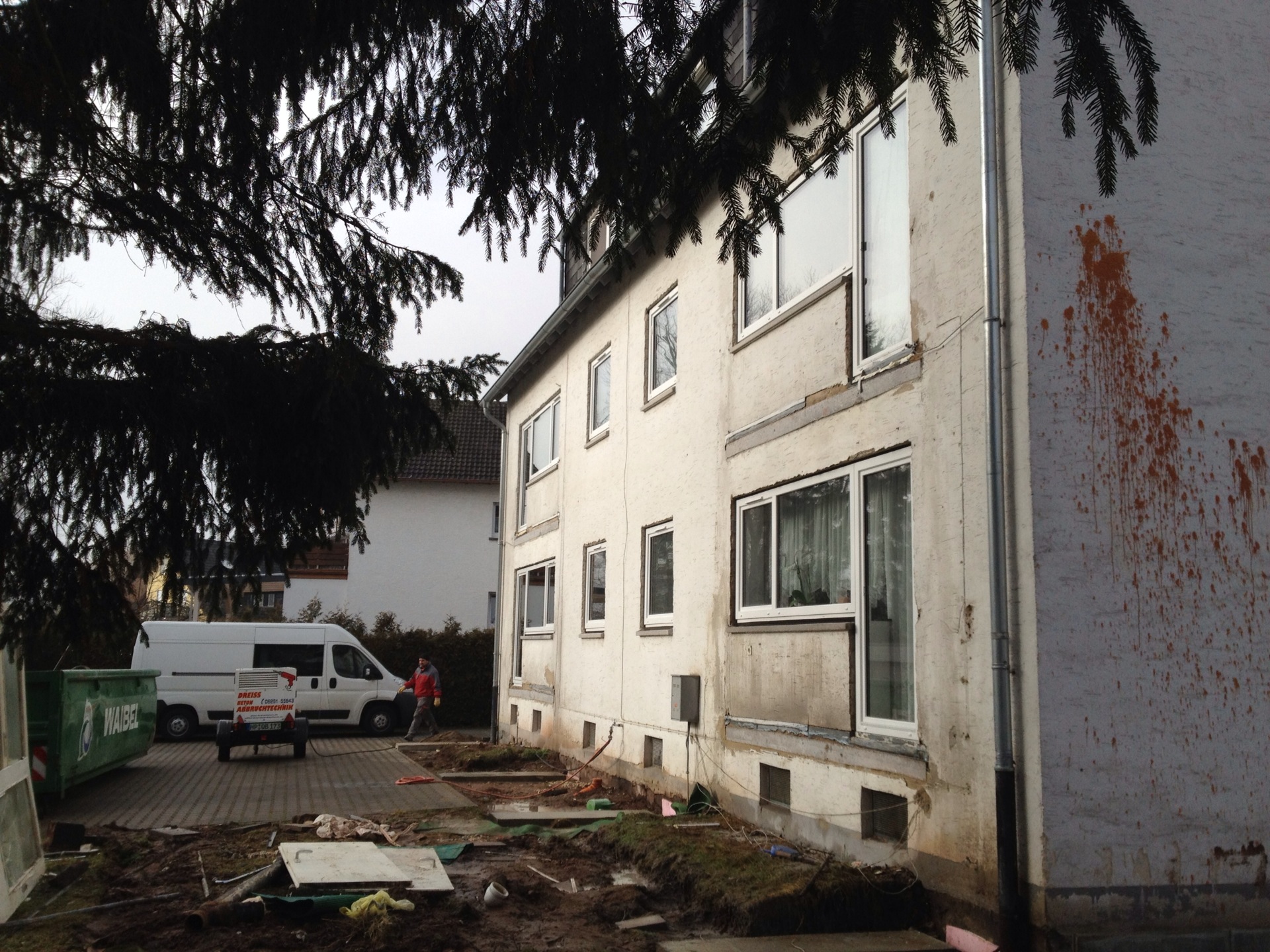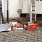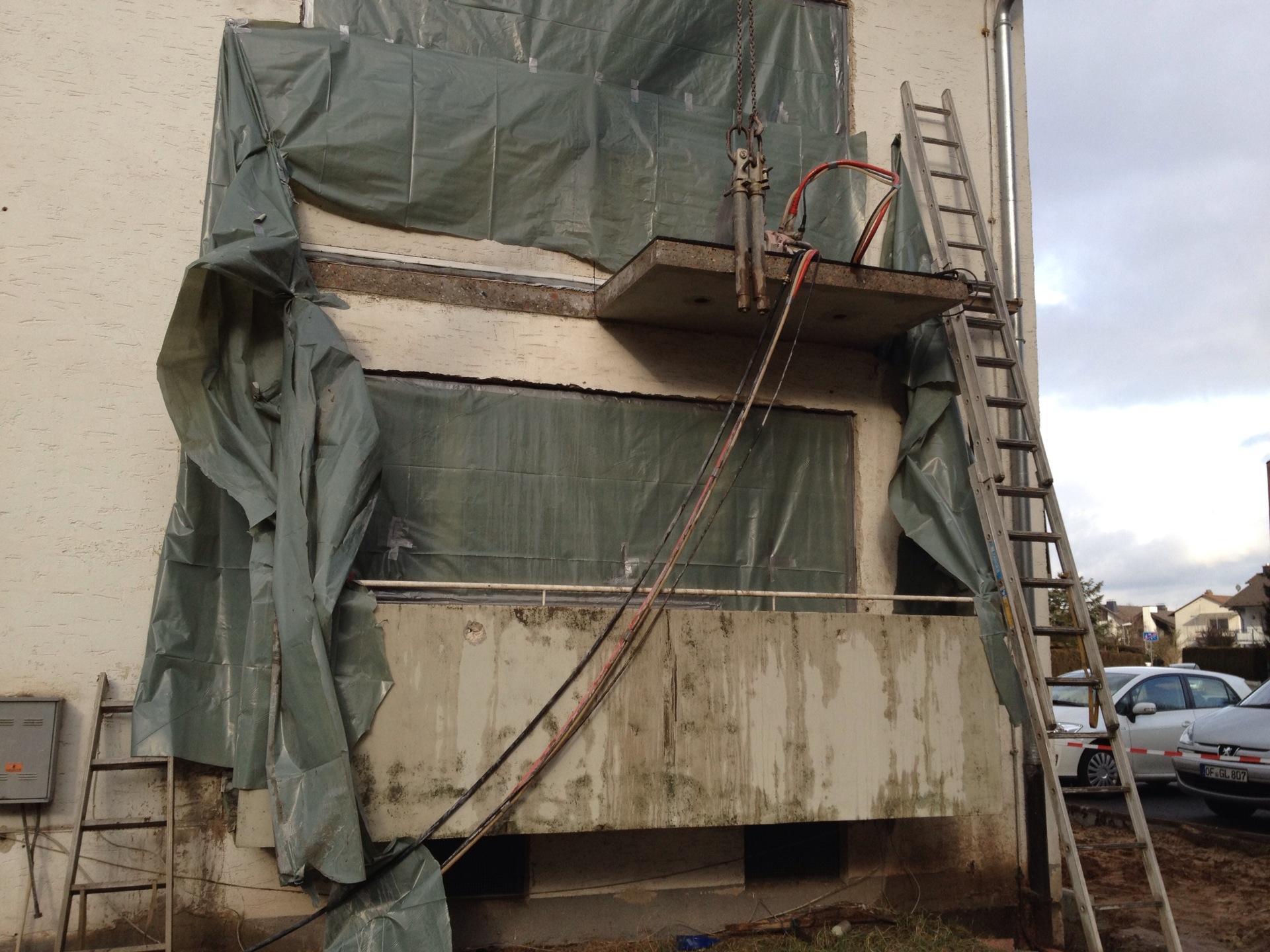 Die energetische Sanierung bringt es mit sich, dass alle „auskragenden Betonelemente“ – also mit dem Haus verbundene Balkone sowie das Vordach – entfernt werden müssen. Nach einigen Überlegungen haben wir uns dazu entschlossen, diese nicht mit Meißeln oder Ähnlichem abbrechen, sondern absägen zu lassen.